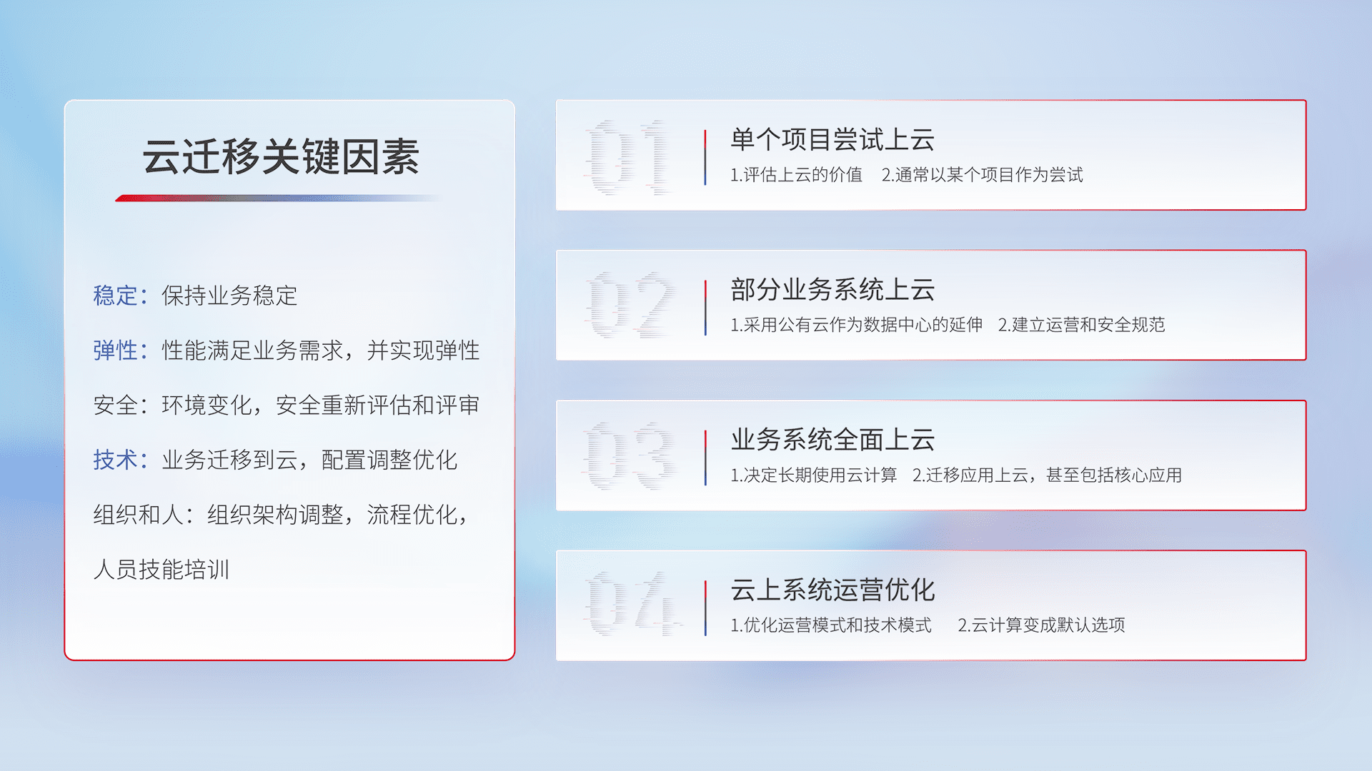 结合实际业务,,,从规划设计、、、云平台选型、、、云原生改造、、、数据迁移、、、集成交付,,迁移全过程为客户识别最佳上云路径,,做好风险识别管理,,,设计网络架构、、身份权限、、、安全审计合规、、操作审计、、、日志审计、、、监控告警策略、、、多站点容灾设计等,,,,对云上基础设施进行整体规划,,,提升IT治理水平,,,,以满足弹性、、、高可用、、高性能的需求。。。